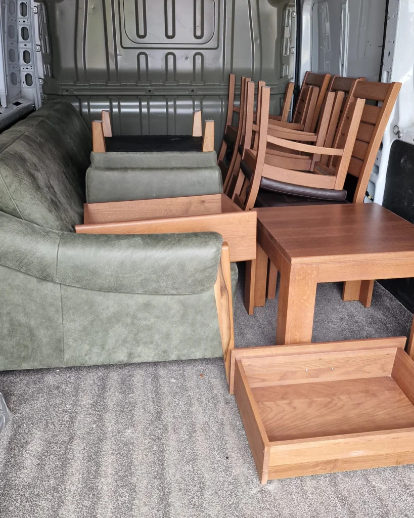 Wnętrze furgonetki wypełnione starymi meblami przeznaczonymi do utylizacji. W środku znajduje się złożona niebieska kanapa, drewniane drzwi, fragmenty szafek oraz inne elementy drewniane ułożone luzem.